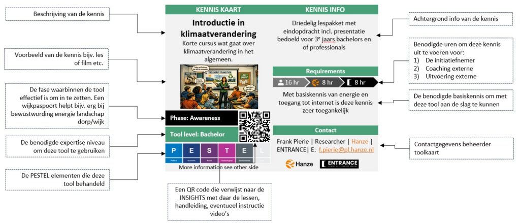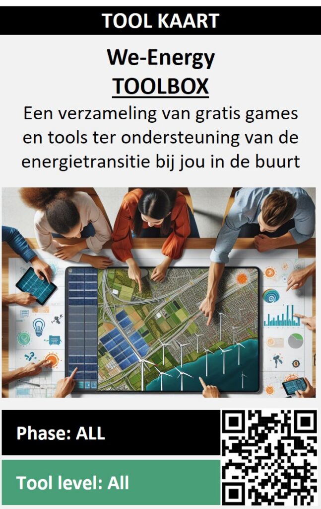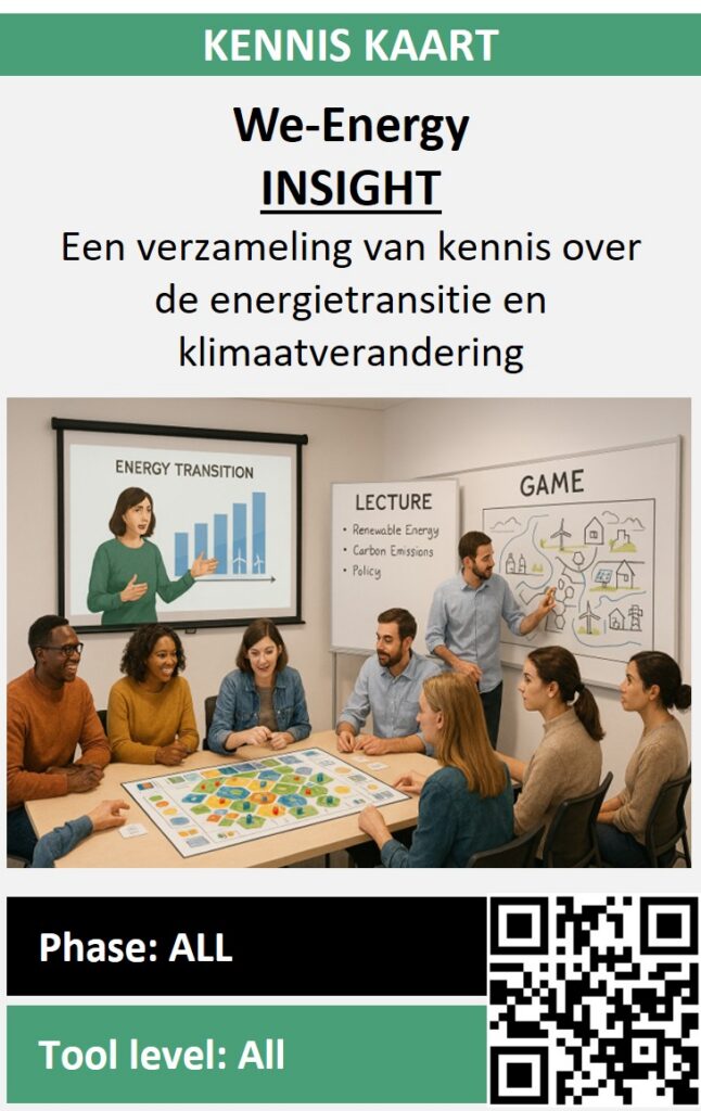 In het onderstaand overzicht staan de drie hoofdthema’s van We-Energy Games, beschreven op een Tool kaart. Daarop staat beschreven in het kort wat de tool doet, wanneer je hem kan inzetten, en welk niveau de gebruiker van de kennis of tool moet hebben om het te kunnen gebruiken. Hieronder een verdere uitleg van een Kennis kaart voorbeeld.