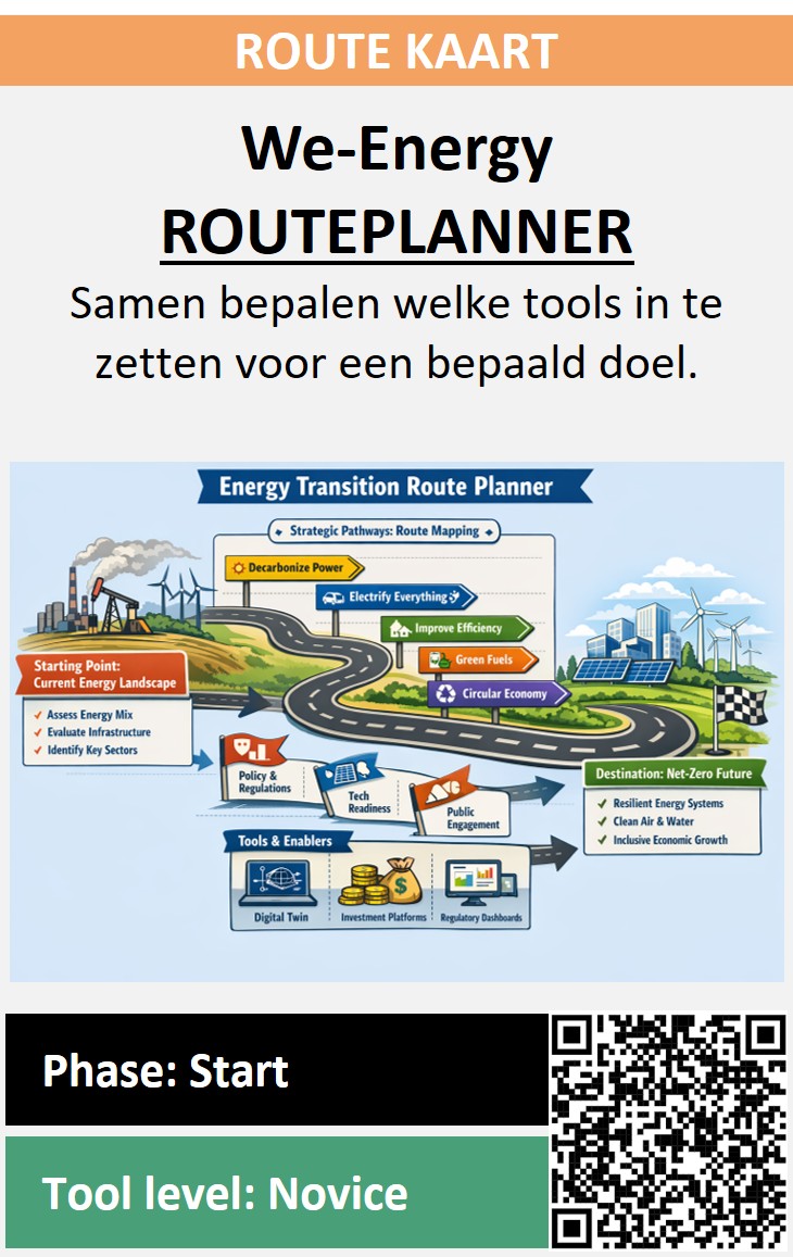 In relatie tot de energietransitie in Nederland wordt er op lokaal niveau omgeving veel veranderingen verwacht, wat betekent dat bedrijven, bewoners, de gemeente, de netwerkbeheerder gezamenlijk oplossingen moeten vinden voor specifieke gebieden en de vele uitdaging die met de energietransitie en of daarbuiten gepaard gaan. Om het voorgaande proces en de benodigde samenwerking daarbinnen goed te laten verlopen is een omgeving nodig waar stakeholders samen tot een breed gedragen oplossing kunnen komen. Deze omgeving wordt binnen We-Energy Games ook wel de ROUTAPLANNER genaamd. Effectieve communicatie is cruciaal voor het verkrijgen van draagvlak voor de energietransitie en voor het nemen van geïnformeerde en gezamenlijke beslissingen. Om toekomstige hernieuwbare oplossingen, zoals bijvoorbeeld een Energiegemeenschap, te kunnen bespreken en ontwikkelen, is het noodzakelijk dat alle stakeholders zich op hetzelfde kennisniveau bevinden, ook wel ze moeten dezelfde taal spreken. Om dit te bereiken moet een gemeenschappelijke taal worden ontwikkeld die stakeholders helpt elkaar beter te begrijpen. Om hieraan tegemoet te komen is bij de Hanzehogeschool Groningen een aanpak ontwikkeld die gebaseerd is op serious gaming: de zogenoemde EnergieTransitie Routekaart (ETR). Binnen deze aanpak ligt de focus op het ondersteunen van processen van bewustwording, bereidheid, planning en monitoring bij stakeholders, zowel individueel als in groepsverband. Gedurende dit proces is het essentieel om de behoeften van stakeholders op elk moment te begrijpen en hen hierop passend te ondersteunen met gerichte interventies, de zogenoemde tools. Timing is daarbij van groot belang, aangezien een interventie moet aansluiten bij de specifieke behoefte van de stakeholders op dat moment. Bijvoorbeeld, een bewezen effectieve tool kan zijn werking verliezen wanneer zij op het verkeerde moment voor een verkeerd doel worden ingezet. De ETR‑aanpak kijkt daarom zowel naar het proces als naar de beschikbare tools. Afhankelijk van de behoeften van de stakeholders kunnen specifieke tools worden ingezet als interventie. Dit helpt stakeholders bij het ontwikkelen van een gemeenschappelijke taal en bij het ontvangen van de juiste informatie op de juiste manier (duidelijk, begrijpelijk en transparant), zodat zij weloverwogen beslissingen kunnen nemen.